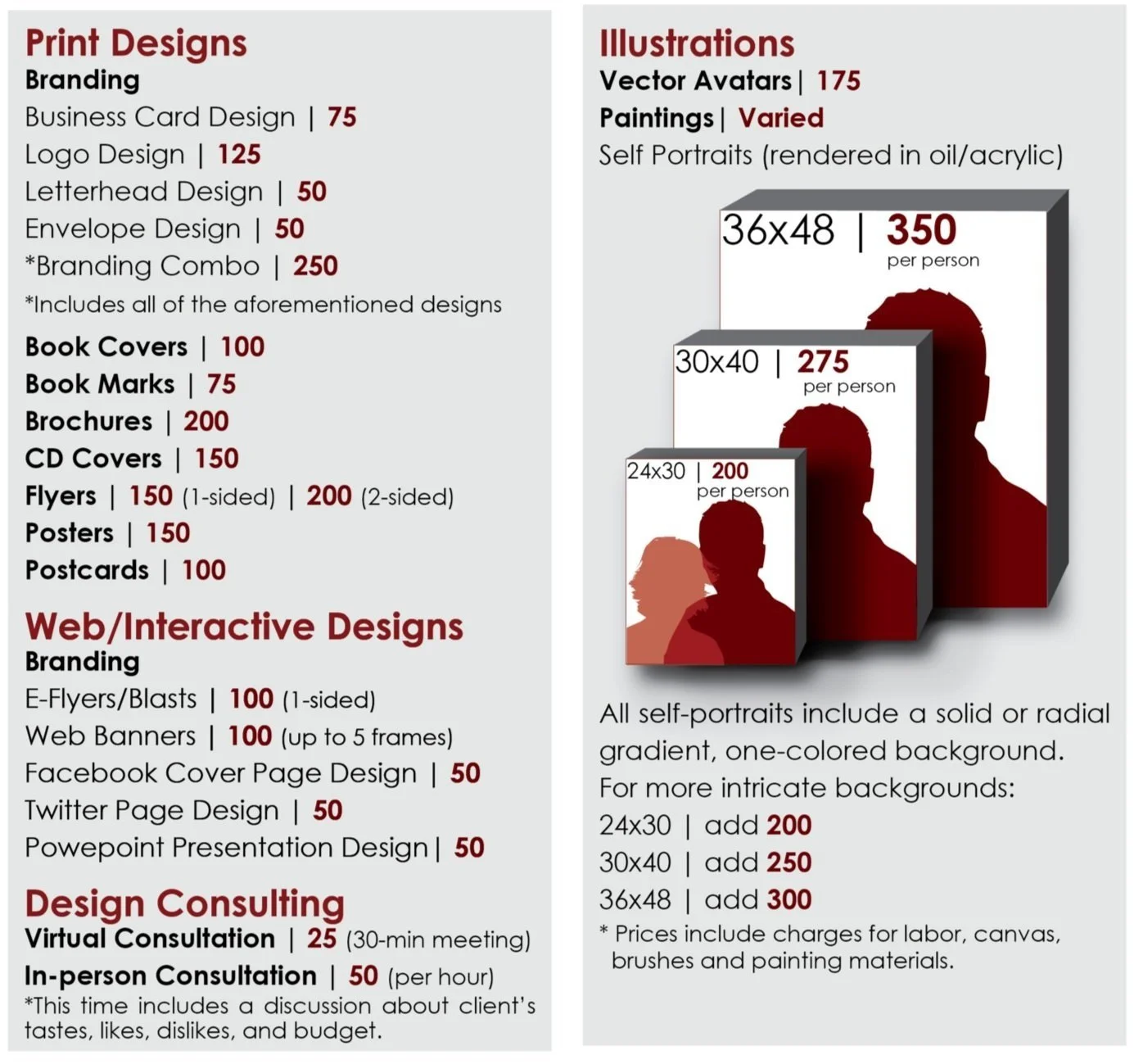 In order to provide satisfactory solutions to your design needs, a phone call or e-mail consultation is recommended prior to project development. All designs include a contract that will outline the terms and conditions of the specified project and describe the necessary work to be done. Once the layout of the project has been agreed upon, a 50% deposit is required to begin production. Proofs of work will be exchanged throughout the design processes. However, the final balance is required before design work is released at the completion of the project.