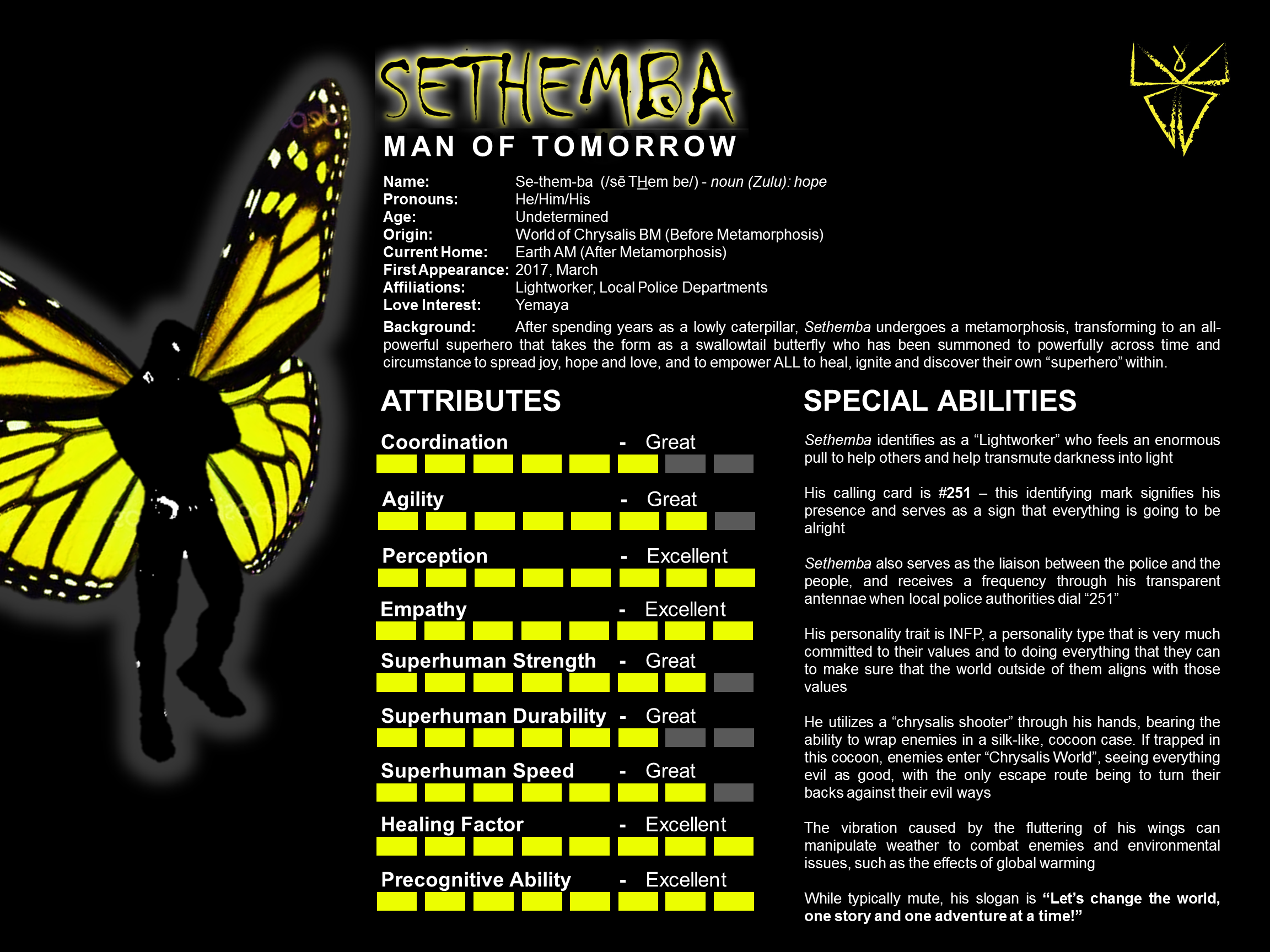 After unleashing an aerial attack against #45 with his swallowtail butterfly squad, Sethemba realized his full potential and ability to #LevelUp! He augments himself into a supernatural, larger than life butterfly, and goes out on a quest to locate and rescue our missing, “Highly Optimistic and Powerfully Efficient” women and girls! She was lost, but now she’s found. She may have been a victim of domestic violence, neglect, abuse, depression or anxiety… but she is home and she is “hope”!